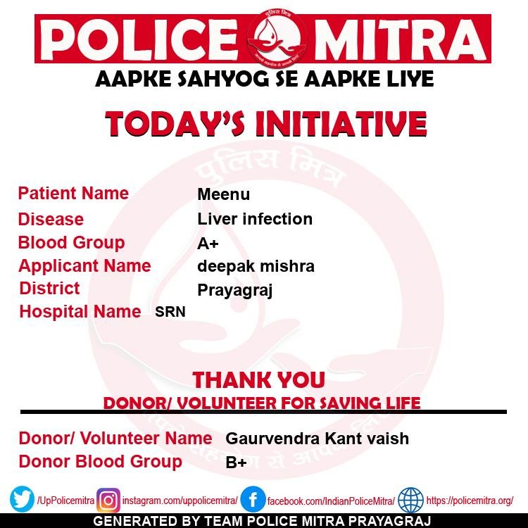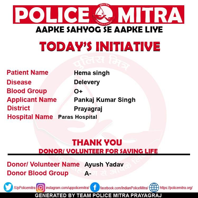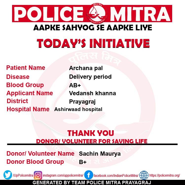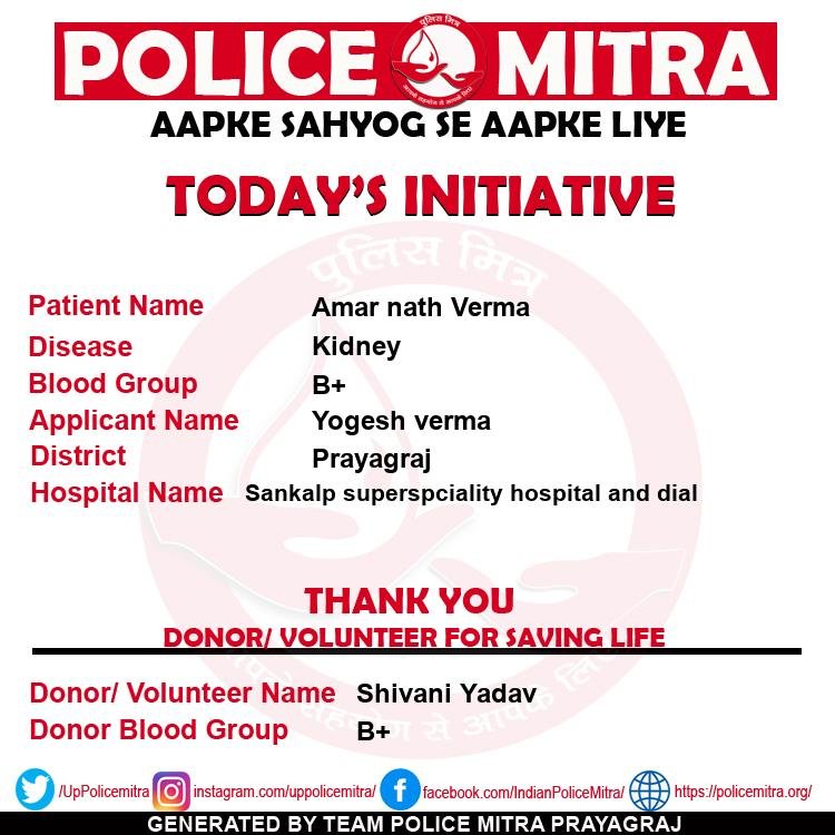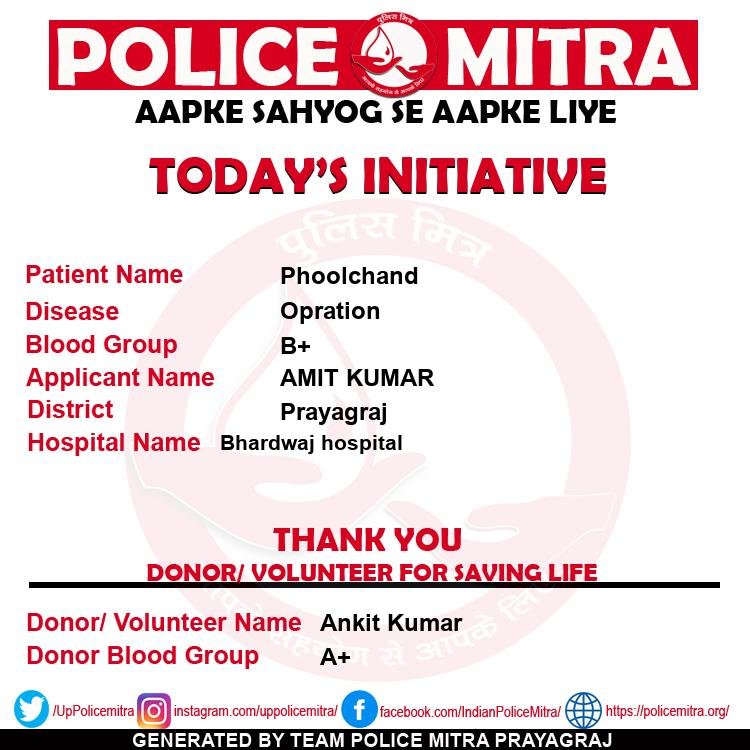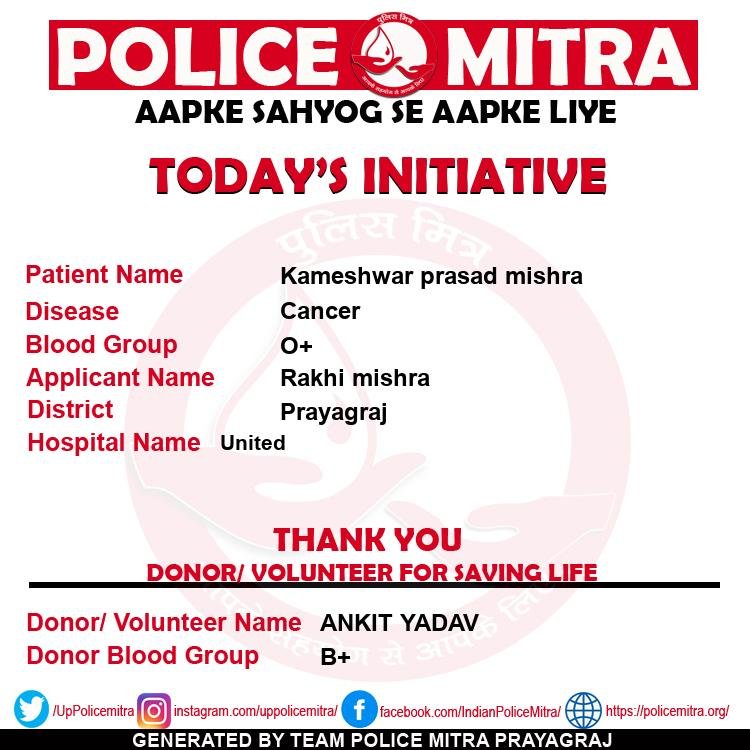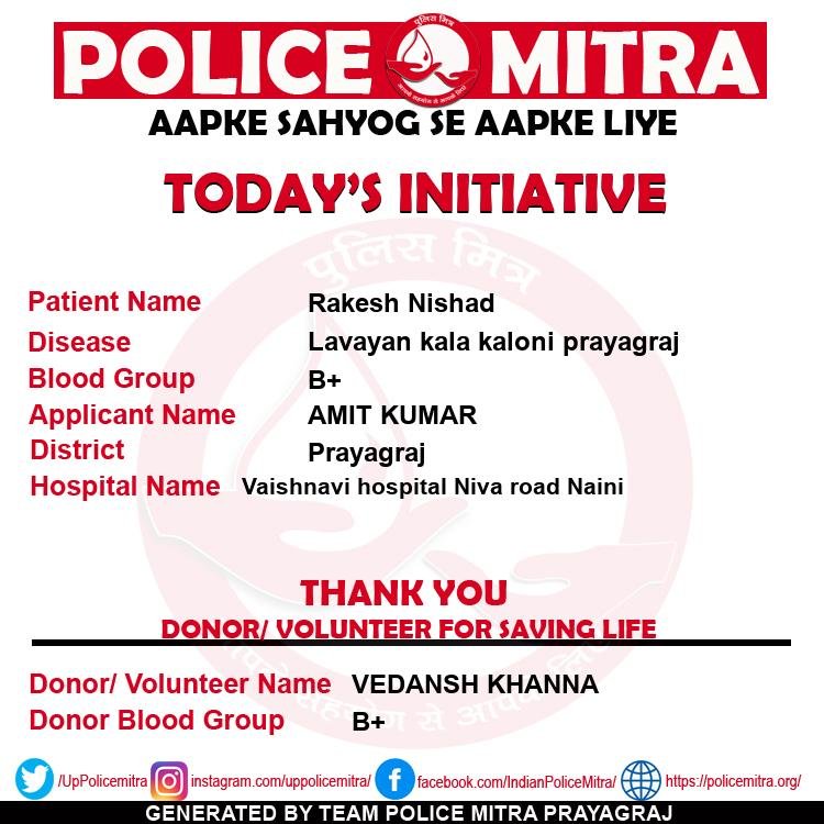 Police Mitra is a non profitable blood donation and blood provider organizations for those who need blood in case of emergency and also looking for free blood support, can get any time support from team Policemitra, this organization is based in Prayagraj and initiated by Mr. Ashish Mishra