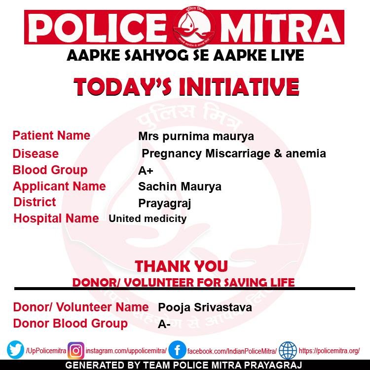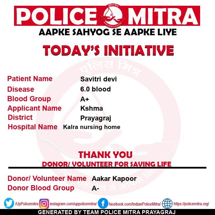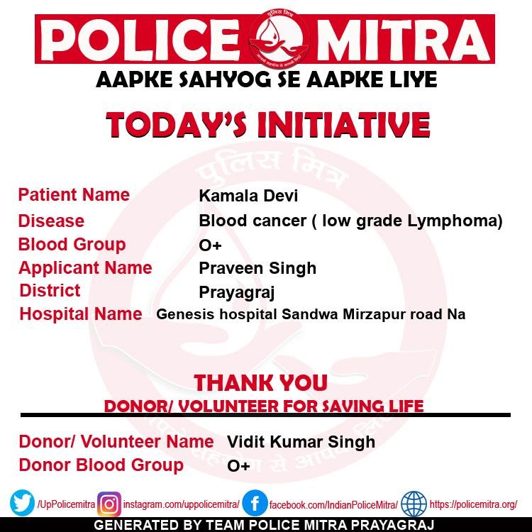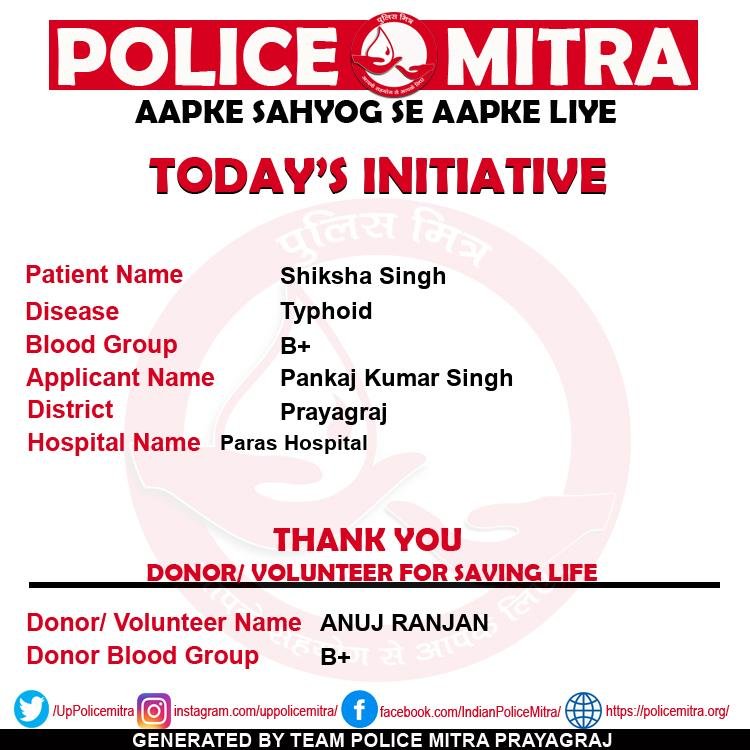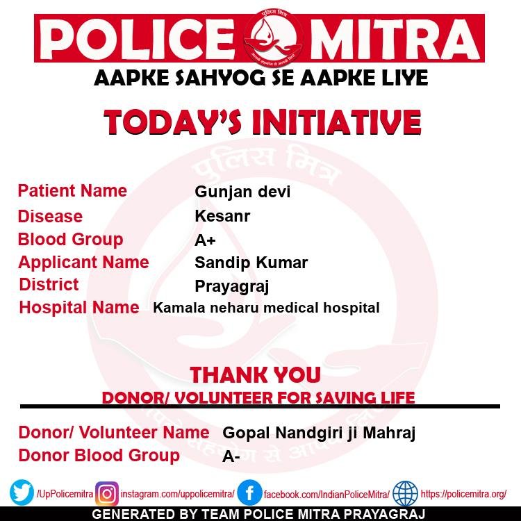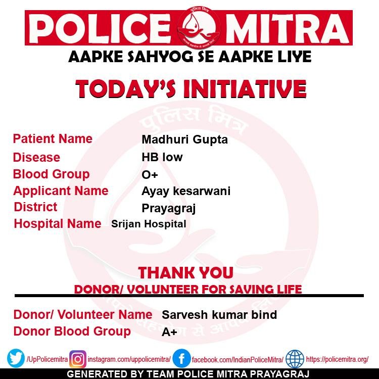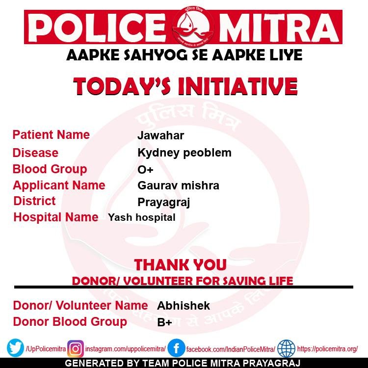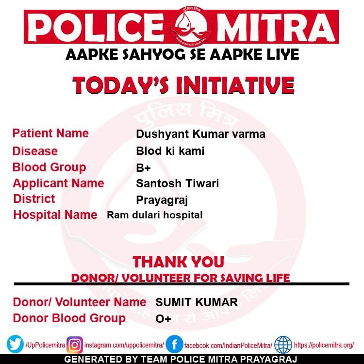Police Mitra is a non profitable blood donation and blood provider organizations for those who need blood in case of emergency and also looking for free blood support, can get any time support from team Policemitra, this organization is based in Prayagraj and initiated by Mr. Ashish Mishra